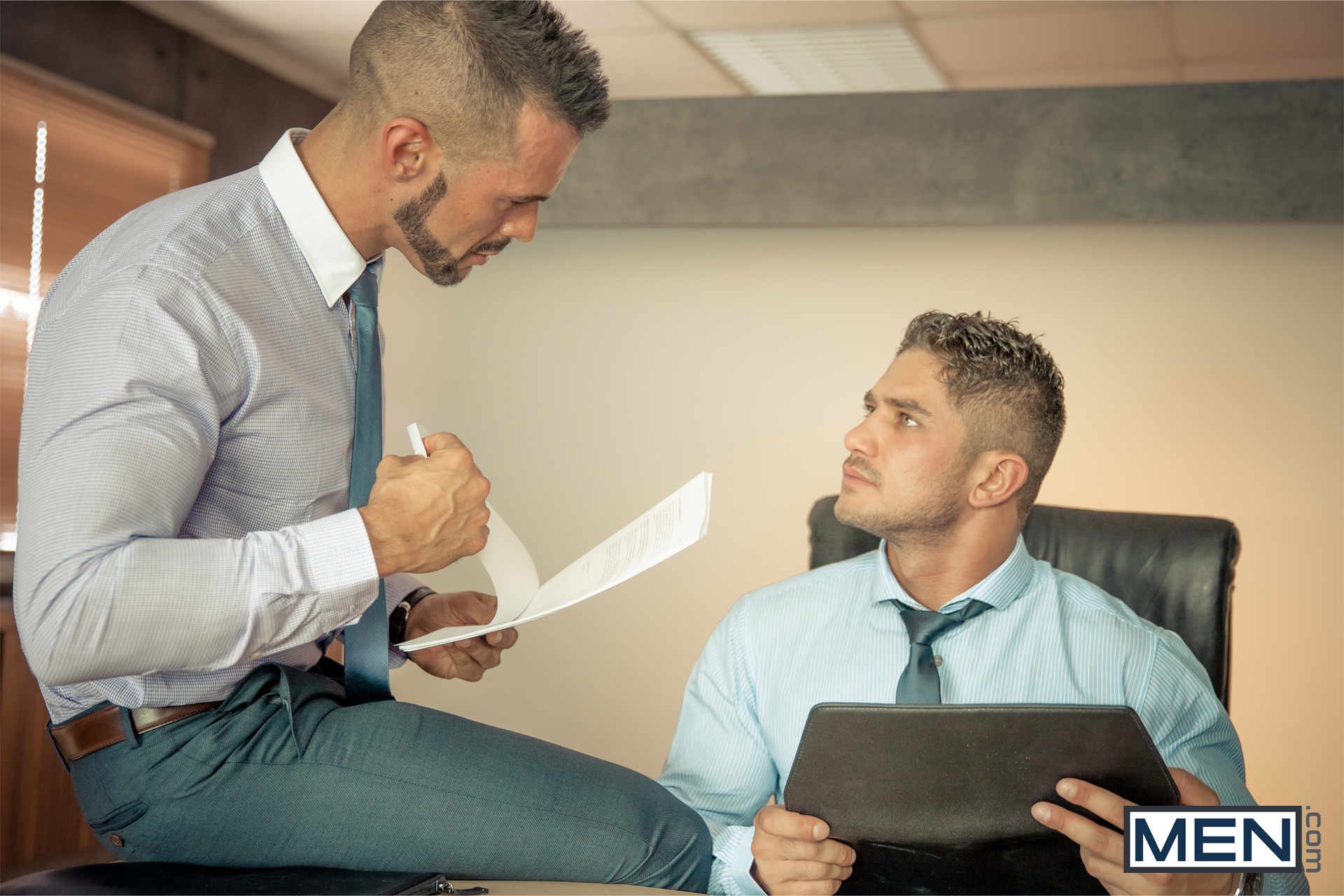 Retrouvez dans cette scène deux des plus grands hardeurs de Men.com : Dato Foland & Denis Vega. Chacun des deux vous charmera par son physique de rêve mais aussi par ses performances sexuelles inégalables. Ils sont les maîtres du business du sexe. Et c’est chacun leur tour qu’ils vont se sodomiser.