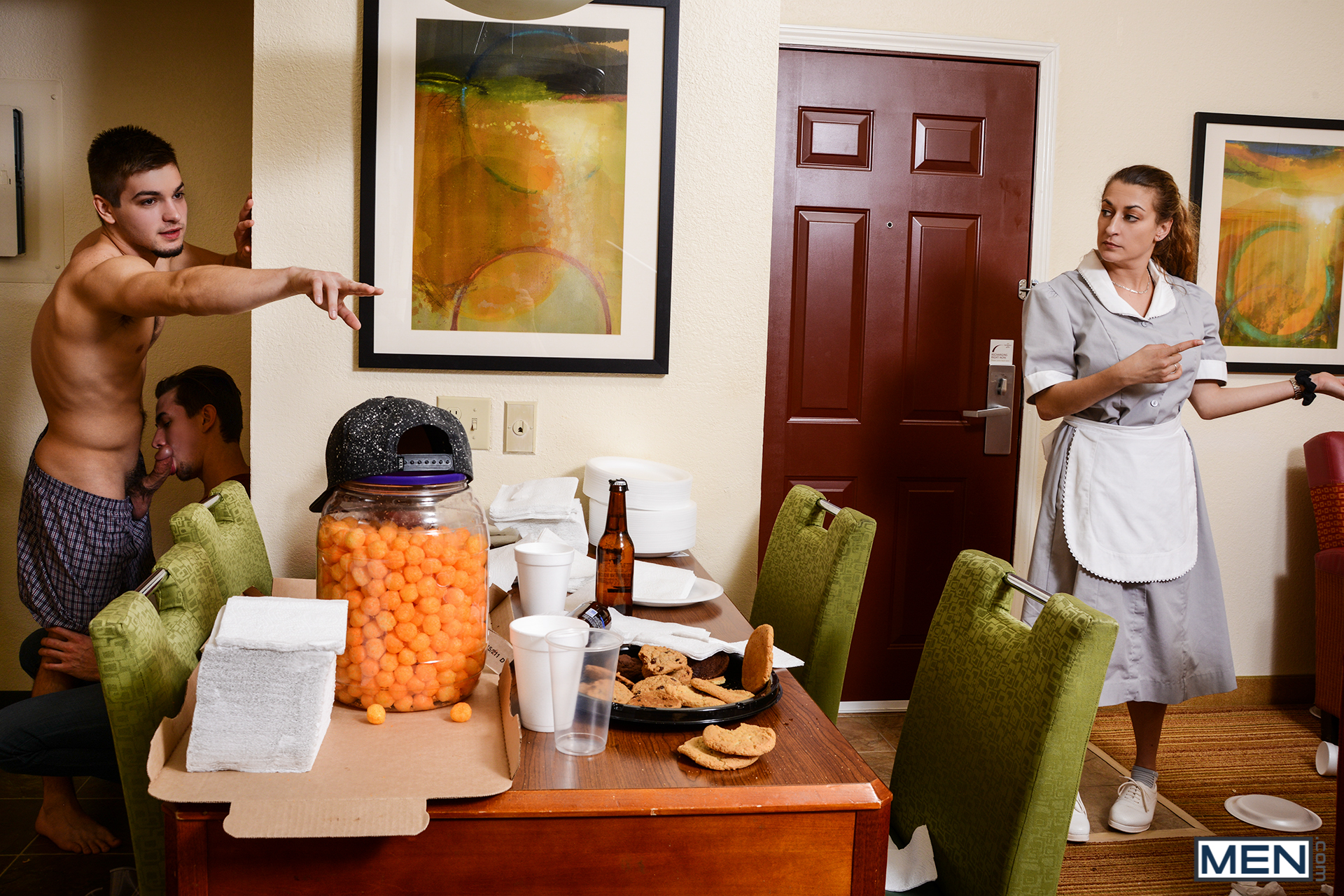 Lorsque Johnny Rapid et Jack Hunter se réveillent après avoir fait la fête dans leur chambre d’hôtel la nuit d’avant , Johnny à la gueule de bois. mais pas Jack qui en profite pour gouter et sucer sa bite juteuse. C’était sans compter sur la femme de ménage qui nettoie leur suite , mais les garçons ne se privent pas de baiser juste à coté d’elle en faisant tout pour ne pas être pris en flag.