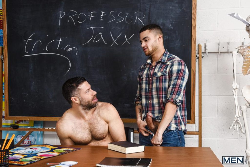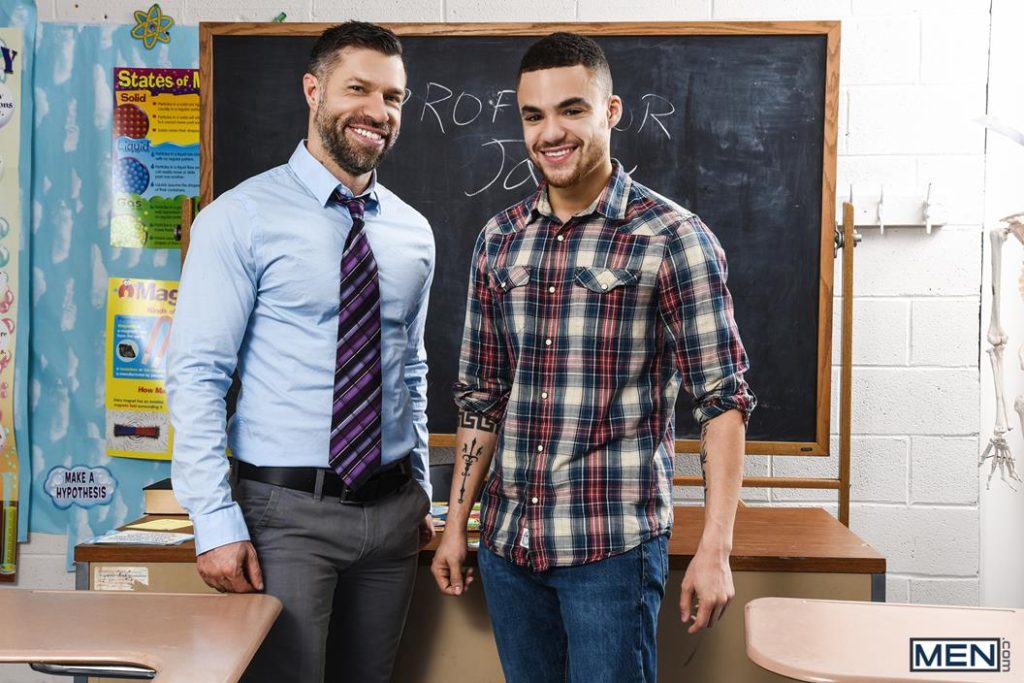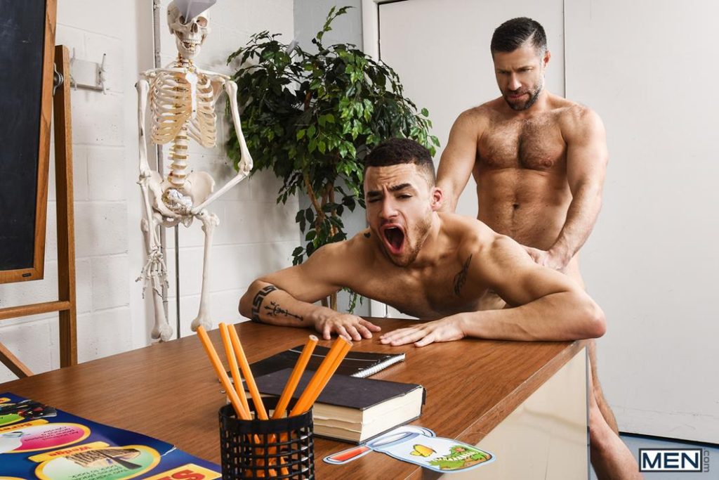 Le cours est ennuyeux et Beaux s’ennuis tout en étant assez excité. Un snap avec ses doigts et voilà que le beau professeur viril se retrouve tout nu et disposé de donner de sa personne pour des cours très privés avec Beaux Banks. Le jeune latino sportif à une bonne queue dont se régale le professeur, mais lui aussi à bien envie de la bite de son partenaire, mais dans son cul !